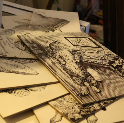 猫を中心とした動物や植物をモチーフにペンを使った細密画を制作。